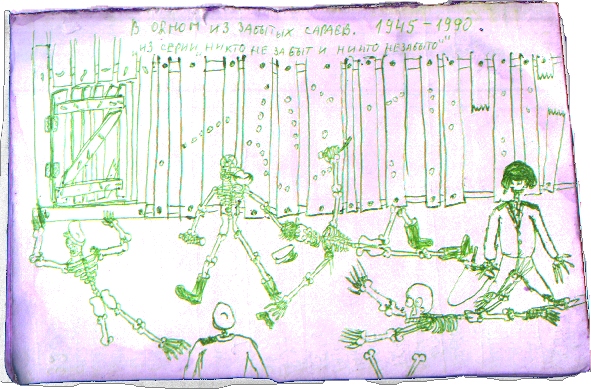 Этот рисунок был сделан на одном из уроков перед Днем Победы. Поскольку графика качеством не блещет поясню, что я хотел этим рисунком выразить: 1990 год, сарай в окресностях Берлина, до сих пор никем не найденный. В центре скелет советского солдата правой рукой держит за волосы останки немецкого офицера, а левой гранату, которой, вероятно, бил когда-то врага по голове. Слева от него видны истлевшие трупы еще двух офицеров вермахта, а справа обычного пехотинца рядового состава. Кому принадлежит шестой скелет я уже не помню. Фрагментов одежды на нем не сохранилось, поэтому даже его принадлежность к Немцам или Русским останется загадкой для истории, как и пара костей внизу :)